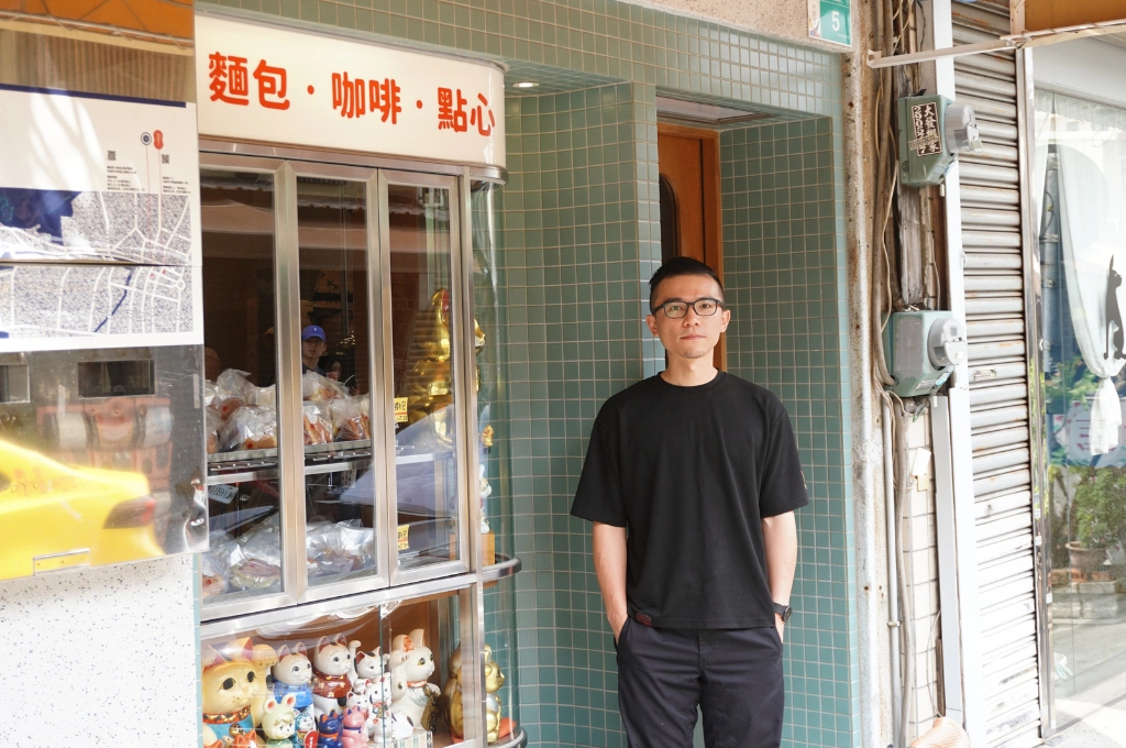 武子靖站在蜷尾家パン台南創始店前,湖水綠磁磚與昭和風格玻璃窗成為遊客取景熱點,不少人特地來此拍照打卡。(圖|放言記者林可妮攝)