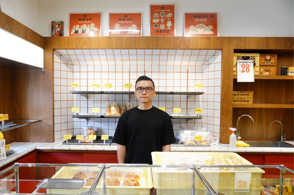 蜷尾家パン共同創辦人暨研發總監、世界麵包冠軍武子靖站在店內麵包櫃前。(圖|放言記者林可妮攝)