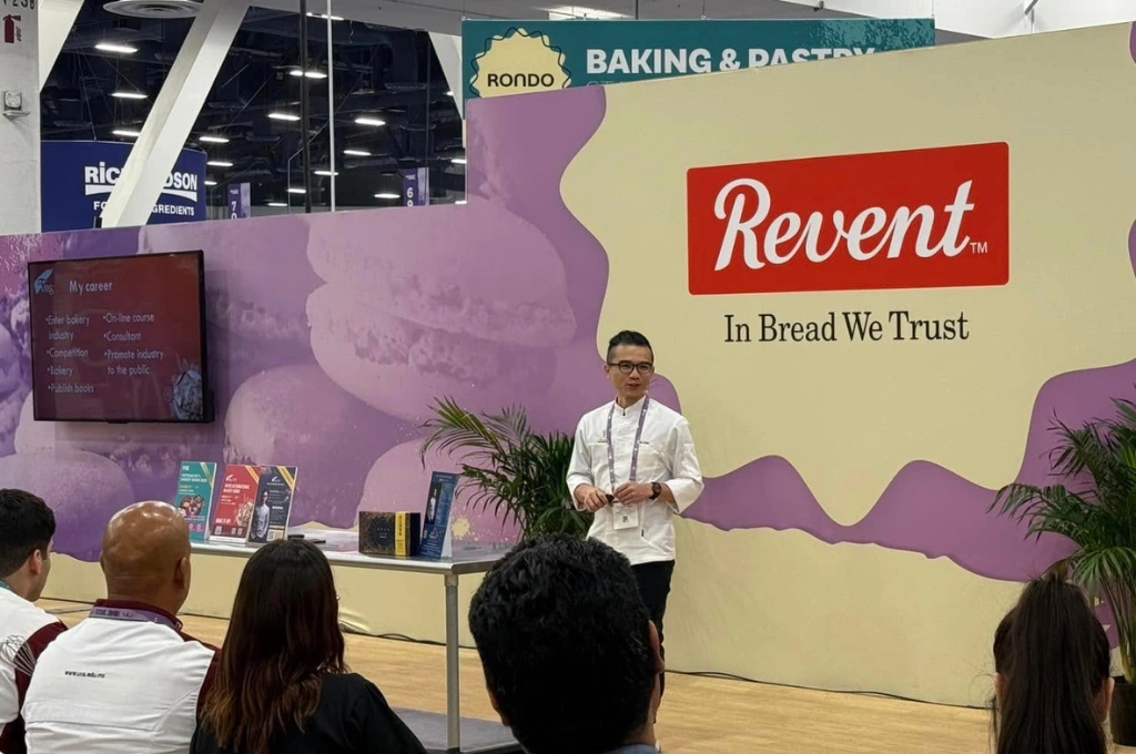 他近年擔任全國技能競賽裁判,也曾帶選手赴里昂參加世界盃賽事;同時以台北國際烘焙展推廣大使身分在海外演講。「上禮拜才去美國拉斯維加斯講台灣的傳統糕點,講鳳梨酥、蛋黃酥的歷史和製法。十二月又要去越南。」他的目標單純而堅定:讓更多國際聽見台灣味。