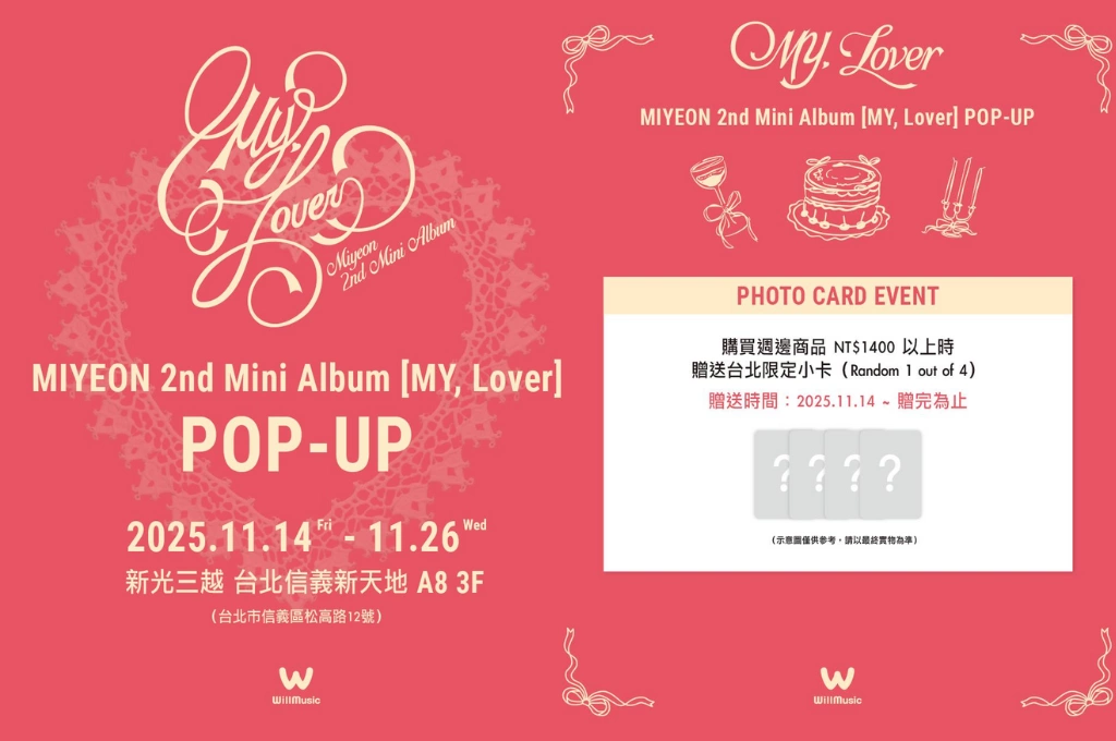 這份名為「愛」的拼圖,如今延伸到台北。自11月14日起,《MIYEON 2nd Mini Album [MY, Lover] POP-UP》將登上台北信義新天地A8館3樓,現場販售以專輯為靈感的限定商品,從半拉鍊上衣、毛毯、肩背包到毛絨小包吊飾,皆以柔和色調重現她的溫柔氣息。快閃店也推出限量小卡活動,消費滿額就能將「台北限定小卡」帶回家,成為台灣粉絲與薇娟之間的專屬紀念。