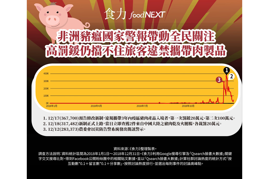 根據《食力》統計2018年最受Facebook網友熱議的十大食安事件排行榜中,非洲豬瘟疫情自2018年8月中國爆發了第一例之後,開始引起廣大網友關注,截至2018年12月31日,討論聲量高達397萬3769則,位居年度聲量排行第1名,數據大幅超前位居第2名的日本核食議題的96萬1836則,且目前聲量仍持續累積上升中。