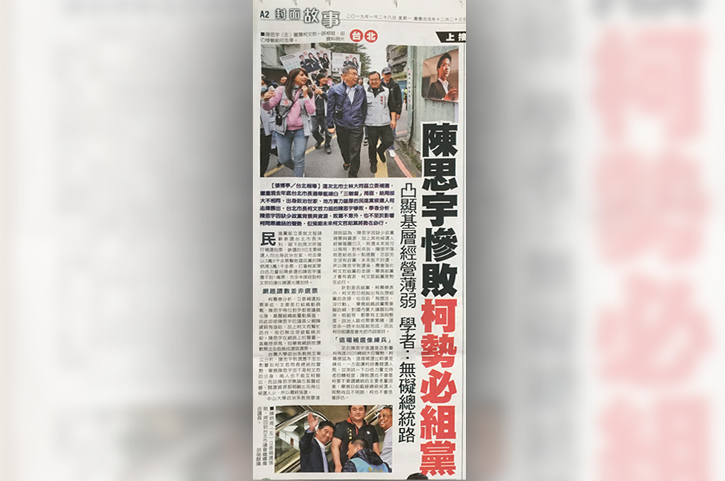 且,陳思宇的慘敗,顯見只靠空戰無法力克藍綠勢力。連任慘勝,讓柯文哲深刻了解政黨重要性,但子弟慘輸,組不組黨,柯文哲恐陷兩難。但依柯文哲的性格,先前已透露組黨盤算,即意味著不論陳是輸是贏,應不會影響他參不參與2020。