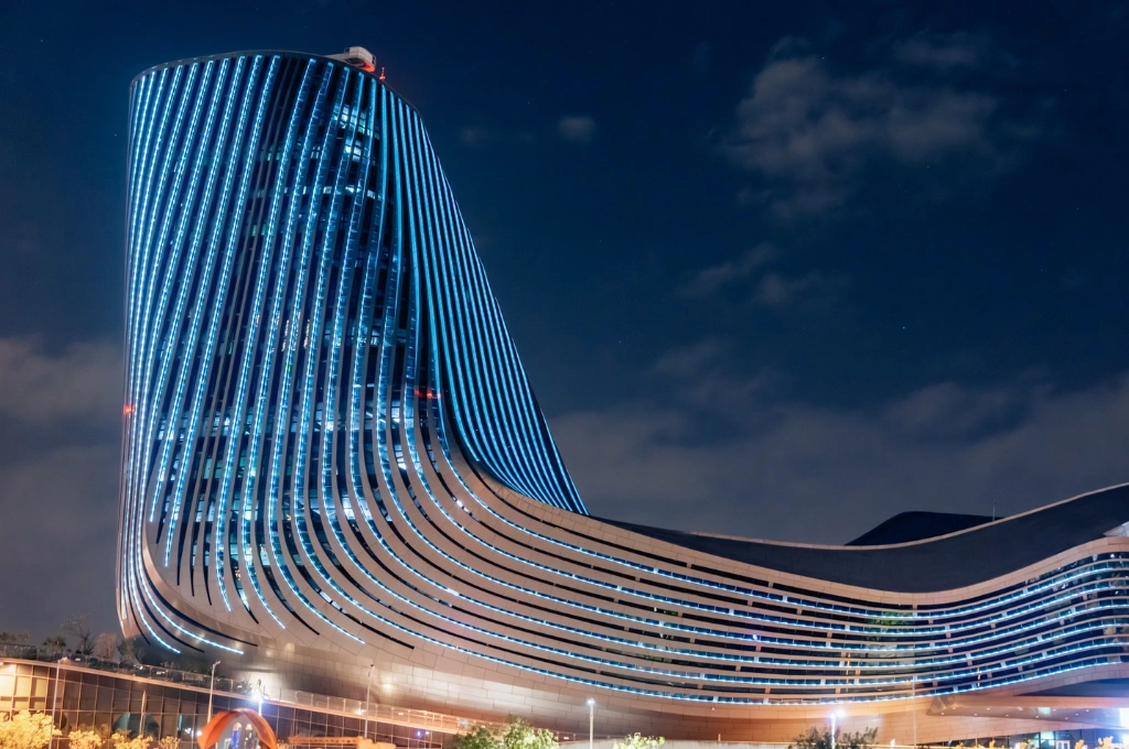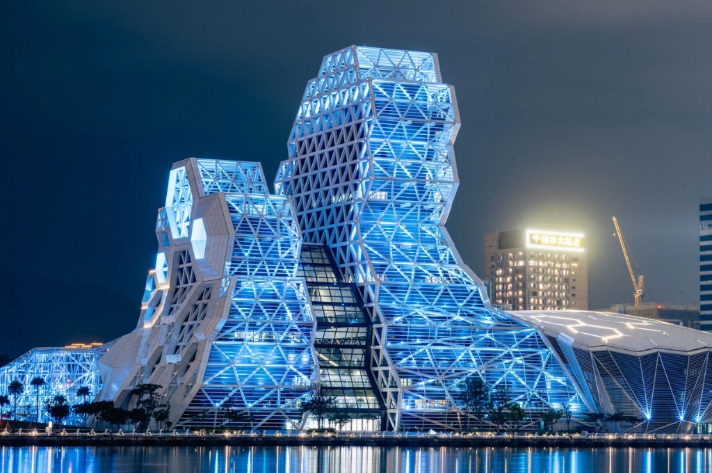 高雄旅運中心夜晚會點上藍色應援燈光