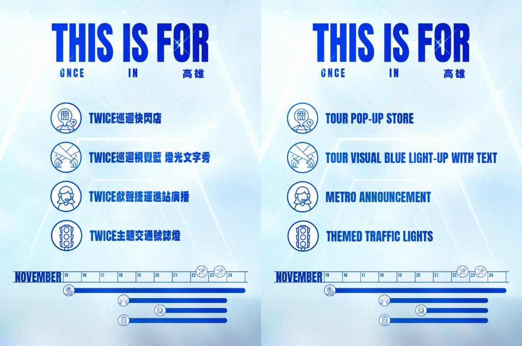 配合TWICE《THIS IS FOR》巡迴主視覺,高雄從11月18日至23日每天晚間17:30至23:00同步亮起藍色燈光,共有七大地標參與,包括大港橋、衛武營國家藝術文化中心、中央公園捷運站1號出口、高雄流行音樂中心、愛河、高雄港旅運中心、美麗島捷運站。部分地標更加碼雷射文字秀,直接將「TWICE WORLD TOUR」投射在城市夜空。