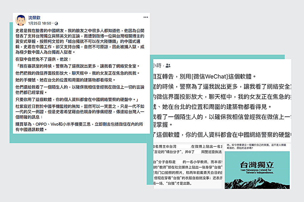 在民主自由的世界裡,臉書、微信都是普遍不過的通訊軟體,在中國,卻活生生成為打擊政治異議工具、監控人民的系統。加拿大約克大學副教授沈榮欽日前指出自己臉書中的中國網友,因公開發表支持台灣獨立與蔡英文的言論,遭逮捕入獄,其與女友在中國軟體微信上的私密對話,竟也成為呈堂證供。對此活生生血淋淋的個案在目,沈榮欽呼籲台灣人「別用『微信WeChat』這個軟體。」