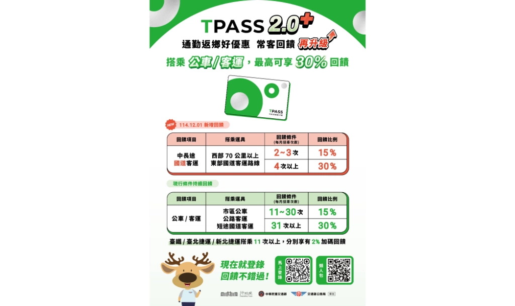 交通部自114年1月起推出 TPASS 2.0公共運輸常客優惠,以「每月搭乘紀錄」提供乘車金額回饋。只要每月搭乘公共運輸達 11次,即可享最高30% 回饋;其中搭乘公路公共運輸(包含市區公車與公路客運)滿11次者最受惠,而已有常客優惠的軌道運輸系統,包括台鐵、台北捷運與新北捷運,也加碼提供2%的回饋金。