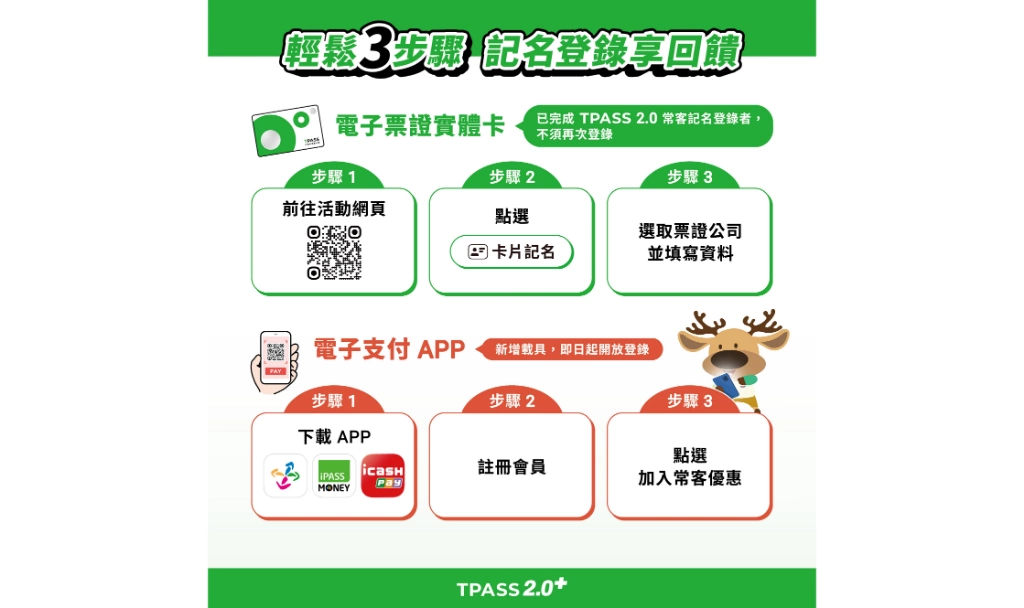 TPASS 2.0+ 除了調整中長途國道客運的回饋門檻,也同步將電子支付納入累計機制,包括悠遊付、iPASS MONEY 與 icash Pay。民眾可即日起透過各票證公司的 APP 完成帳號登錄,並成為 TPASS 2.0+常客優惠會員。自12月1日起,只要完成登錄,系統就會開始自登錄次日起,累計當月公共運輸搭乘紀錄,並於次月25日由票證公司自動匯入回饋金至電子支付帳戶。