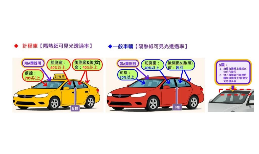 交通部指出,台灣位處副熱帶地區,日照強烈、氣候潮濕,多數民眾會為隔熱、防紫外線或降低眩光而貼隔熱紙,但許多人對透光率認知不足,誤貼過深隔熱紙而影響視野,夜間及雨天尤為明顯。為兼顧隔熱與安全,公路局參考我國氣候、道路安全需求、國人用車習慣、價格可負擔性以及各國規範後,以車輛「B 柱」作為分水嶺:B 柱以前為駕駛主要視野範圍,以安全為優先;B 柱以後則考量計程車等運輸業型態與乘客安全,訂出以下建議值: