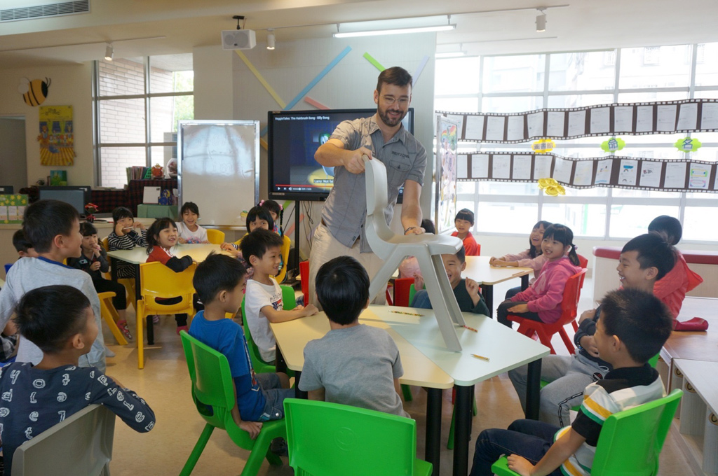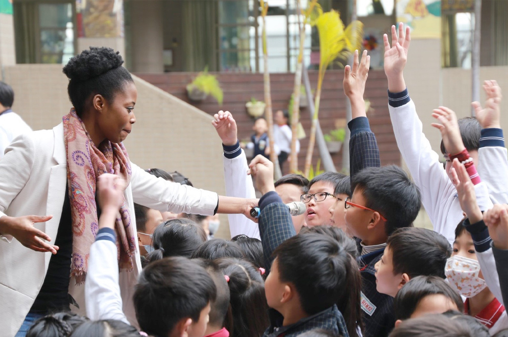 (潭子區頭家國小外師分享南非文化,讓學生勇於開口,師生互動熱絡。)