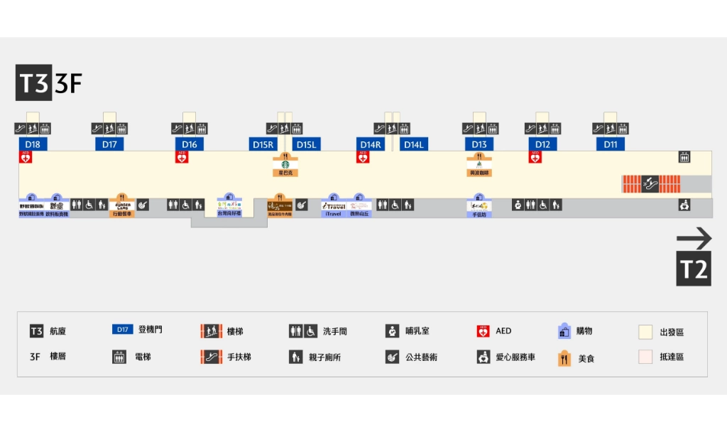 走進新啟用的登機廊廳,旅客最直接面對的,其實是「怎麼走、要走多久」。北登機廊廳自第二航廈D10向北延伸,串聯D11至D18共八個登機閘口。出發層位於三樓、抵達層設於四樓,旅客從第二航廈步行前往最遠登機門,約十五分鐘可達,沿線設有雙向電走道,分散人流、降低長距離步行的不便。