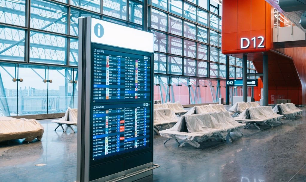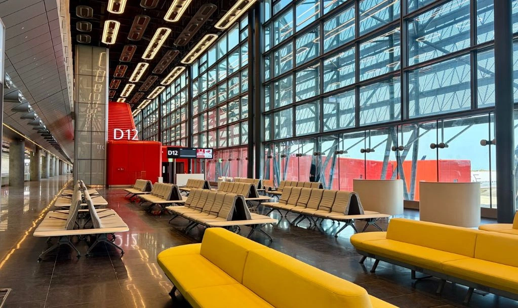 大面積玻璃迎進自然光,飛機在跑道上滑行、起飛與降落的動態,成為候機時的背景。旅客拖著行李走進這裡,抬頭望見挑高結構與柔和擴散的燈光,有人停下腳步拍照,也有人低聲驚嘆,彷彿走進歐洲的國際機場。
