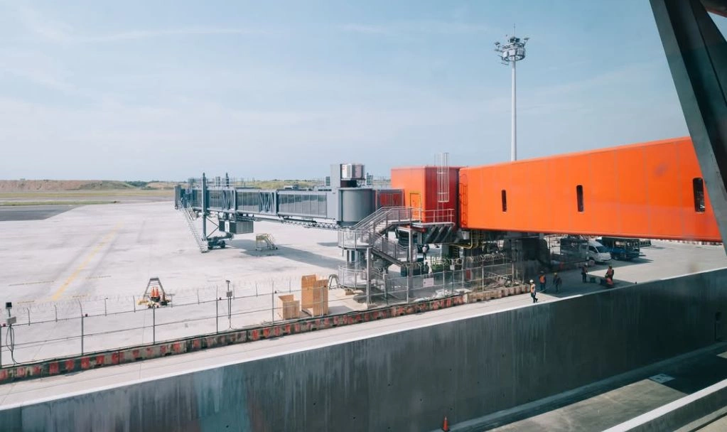 橘紅色空橋延伸至停機坪,成為第三航廈北登機廊廳最醒目的設計特色之一。