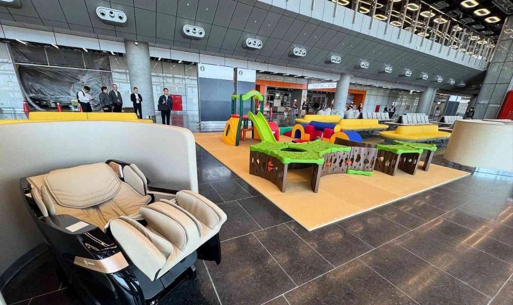 北登機廊廳候機區結合按摩椅與兒童遊戲空間,回應家庭旅客與長時間候機需求。