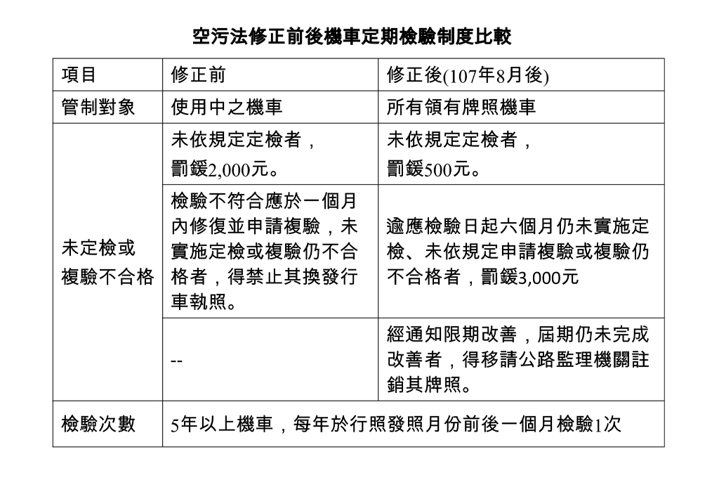 以往為確認管制「使用中」機車,環保局會派員至路邊稽查、或利用車牌辨識系統拍攝行駛中機車,檢查是否完成當年度排氣檢驗,或利用明信片、郵簡及雙掛號三階段通知車主,最後仍未完成檢驗才會開罰,但環保局強調,空污法修訂後,不論是否為「使用中」,凡當年度逾期未檢驗者皆會受罰。
