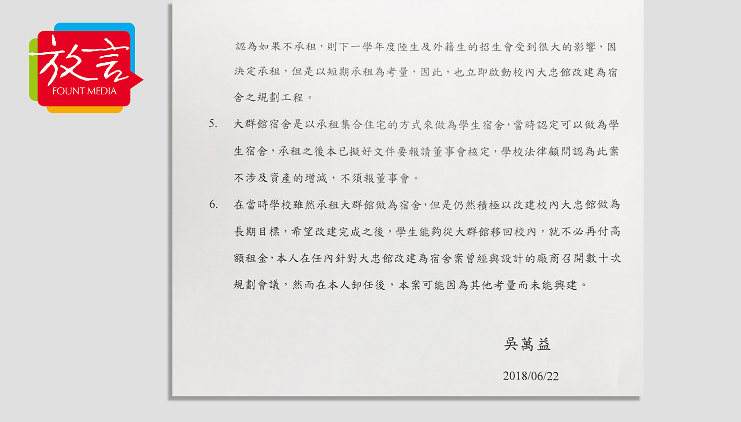 5. 大群館宿舍是以承租集合住宅的方式來做為學生宿舍,當時認定可以做為學生宿舍,承租之後本已擬好文件要報請董事會核定,學校法律顧問認為此案不涉及資產的增減,不須報董事會。