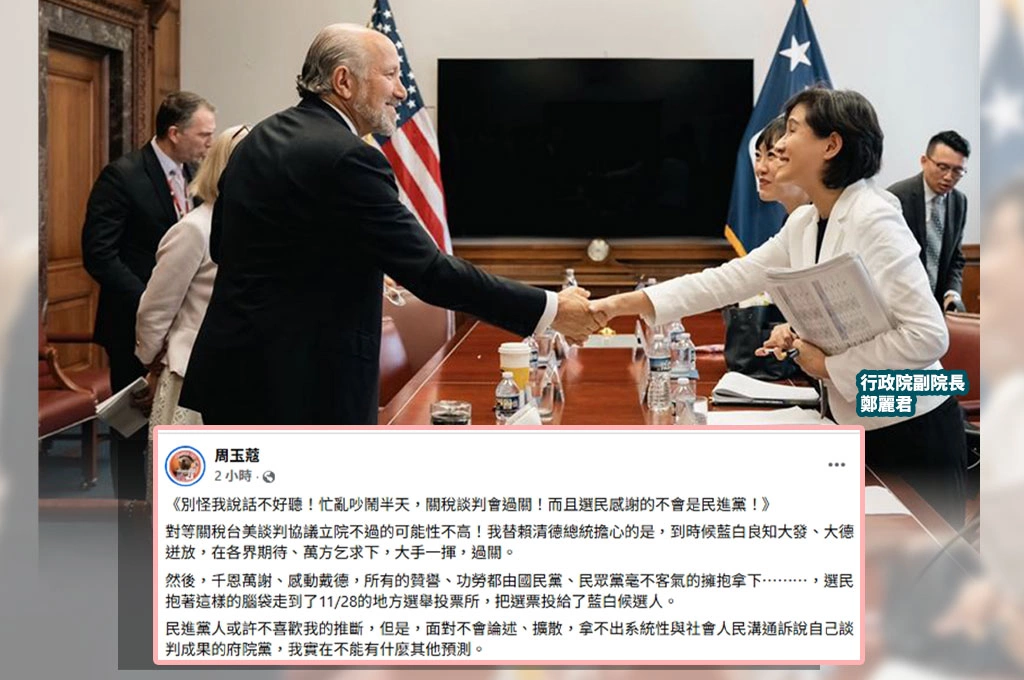 周玉蔻指出,對等關稅台美談判協議在立院不過的可能性不高,但替賴清德總統擔心的是,到時候藍白良知大發、大德迸放,在各界期待、萬方乞求下,大手一揮,過關;然後千恩萬謝、感動戴德,所有的贊譽功勞都由國眾兩黨毫不客氣的擁抱拿下。