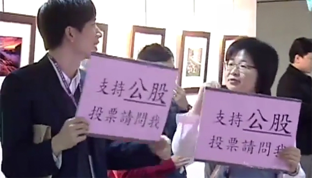 2014年彰銀董事改選期間,公股陣營手持「支持公股 投票請問我」標語,徵求委託書。