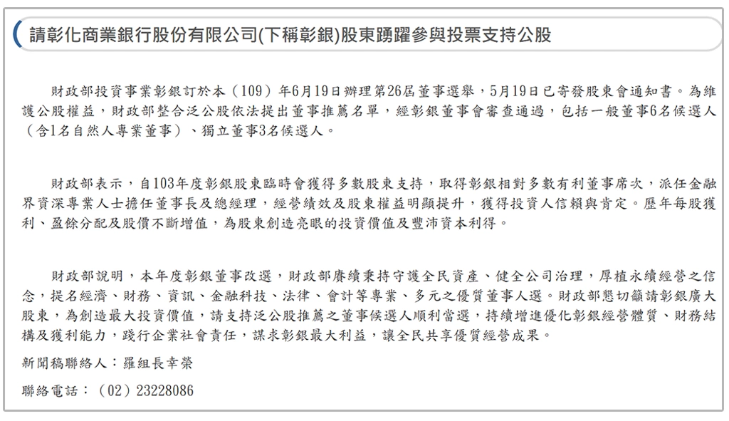 2020年彰銀董事改選前發布新聞稿,公開呼籲股東支持公股代表。