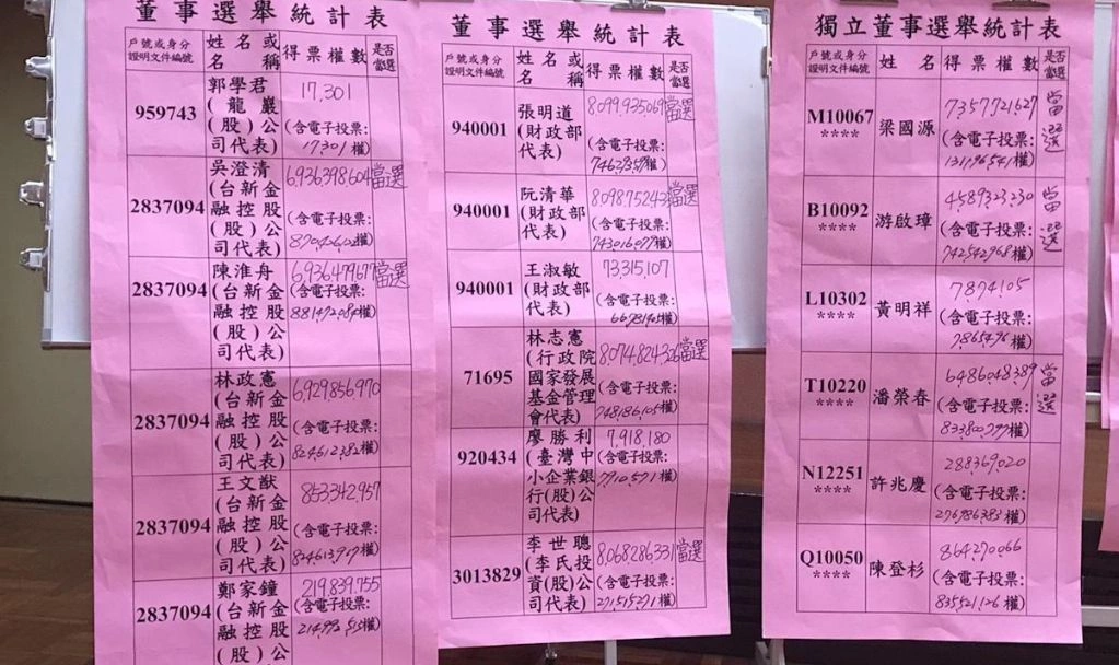 股東會最終改選6席一般董事與3席獨立董事,泛公股陣營拿下5席董事,續掌董事會過半數;台新金控則取得4席董事,包括1席自然人董事與3席獨立董事,仍未能取得主導權。