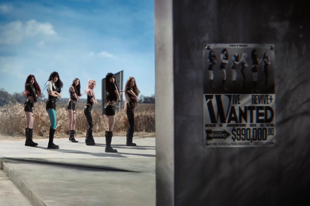 〈BANG BANG〉MV遠赴義大利的里雅斯特(Trieste)取景拍攝,同樣成為討論焦點。畫面中,IVE化身為西部亡命之徒般的角色,穿梭於現代城市與荒涼自然景觀之間,展開一場追尋寶藏的冒險旅程。影片大量運用「WANTED」通緝海報作為視覺線索,營造被追逐的緊張氛圍;最終成員們成功擺脫追擊,完成一段充滿戲劇張力的敘事。MV也結合粗獷主義(Brutalism)風格的巨大建築與沙漠景觀,搭配鮮明色彩,打造出非現實卻極具美感的視覺效果,整體規模宛如電影大片。