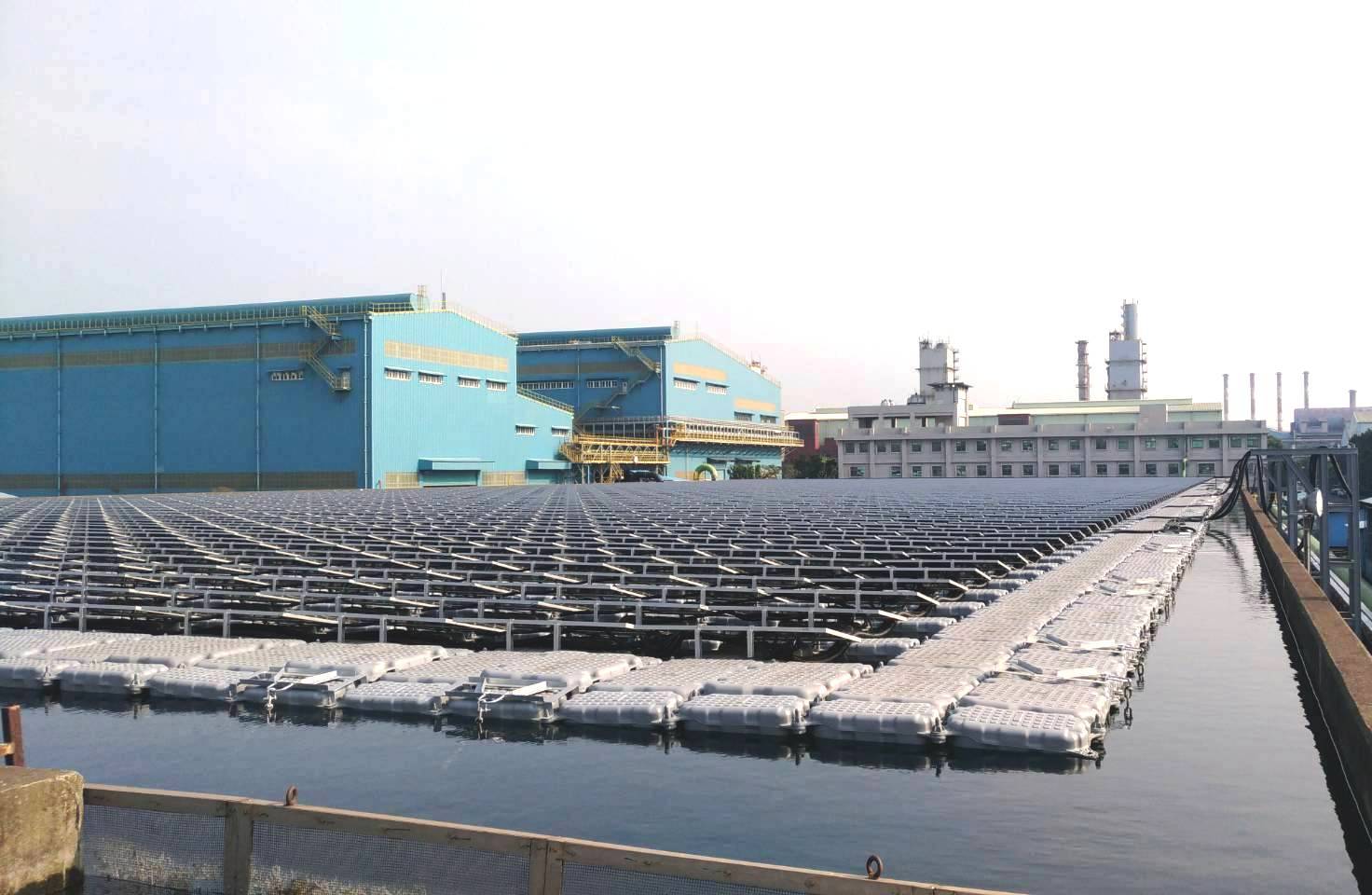 (中鋼廠區水面型太陽能光電系統,水面上是太陽光電,水面下是引進的都汙再生水,皆意涵中鋼重視環境永續及善盡企業社會責任。)