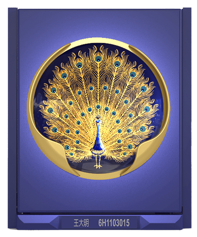 「復行數十步,豁然開朗。」映入眼簾是高貴沉穩的藍色琉璃表面,面板上綴著孔雀,猶如桃花源內的奇珍異獸,祈求帶給後人祥瑞富貴與極上的幸福。藍色琉璃帶著晶瑩光澤,實為純粹深遠的鈷藍色,從質地堅硬顏色極白佐以藝匠精心燒製的琉璃釉法,才蛻變成藍寶石面貌。而開屏的孔雀採立體浮雕設計,搭上24K金的顏料,由國家級畫師一絲一羽手工描繪、孔雀翎以最頂級工法羽化而出。龍巖透過與日本皇室頂級瓷器品牌「大倉陶園」的合作,正式將神話中的情境幻化為真。