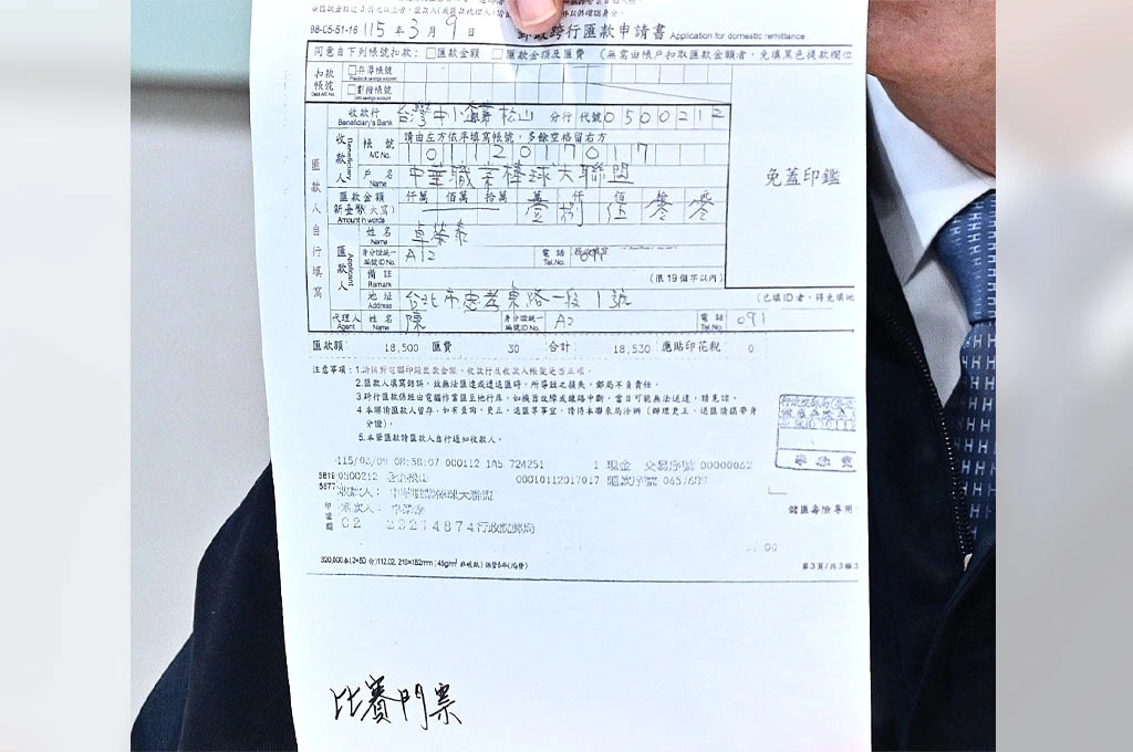 卓榮泰說,單據有4份,一份是進場的門票、一份是當日遊覽車車資、一份是包機費用,還有一份是日幣換匯的水單。他說明,遊覽車車資日幣20萬,是3月7日當天直接付給司機;接著是比賽門票,一共台幣1萬8500元,款項由他匯出、受款人是中華職棒大聯盟。