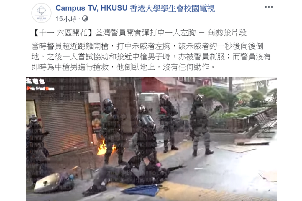 報導指出,防暴警察則拿出手槍指向示威者,一名黑衣示威者試圖打掉手槍,警察被打中手部後開槍,傷者倒在地上後大叫心口好痛,有示威者上前搶救,也被警察按倒,之後才有消防員上前搶救。甚至,香港警方昨晚七時左右發布新聞稿,緊急呼籲所有市民留在安全地方,切勿外出,並留意最新狀況。