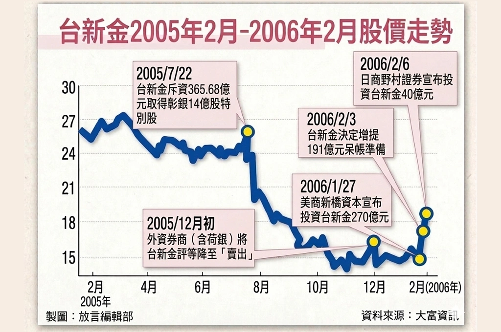當時聯合報指出,傳聞新橋入股的先決條件,是要求台新金必須讓雙卡呆帳金額「完全透明」。因此,2006年2月3日股市開紅盤當日成了戲劇化的一天,當市場正因新橋入股消息激勵、股價直奔漲停時,終場以19.55元作收。兩小時後,台新拋出了一顆震撼彈:宣布大幅提列呆帳準備,去年財報由盈轉虧。