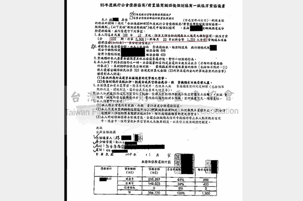 雙卡風暴後,無力清償的債務人透過協商整合負債,向銀行重訂還款條件。(圖源:台灣金融財富重建協會)