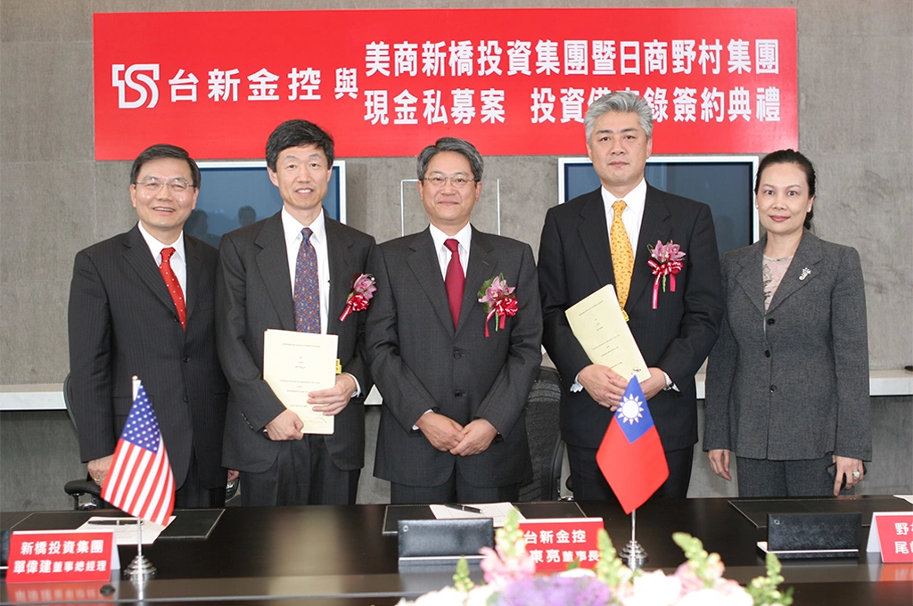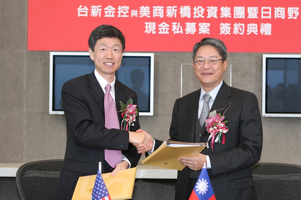 2006年3月14日,台新金現金私募簽約典禮上,董事長吳東亮(右)與新橋投資集團董事總經理單偉建(左)握手完成簽約。