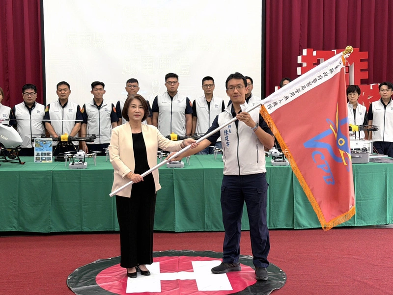 警用無人機隊今天成軍,屏東縣長周春米主持授旗典禮,象徵屏東警政邁入全新時代。周春米會中表示,連續假日期間,台一線交通常出現壅塞情形,透過無人機可提前掌握路況、及早應變;另外,屏東地形山海交錯,常有外縣市犯案跑到屏東來,因此在治安任務負擔更重。