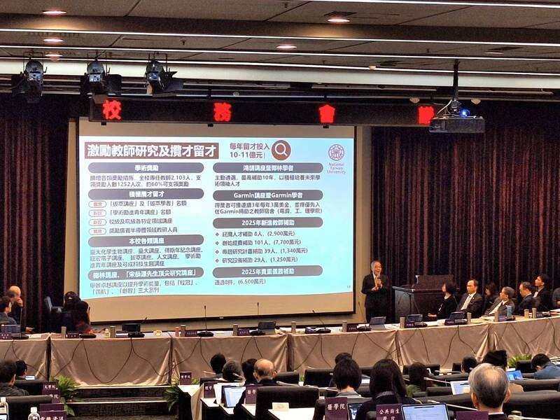 台灣大學今天舉行校務會議,由校長陳文章報告學校現況、校務發展策略項目、激勵教師研究及攬才留才、延攬國際人才方案等。