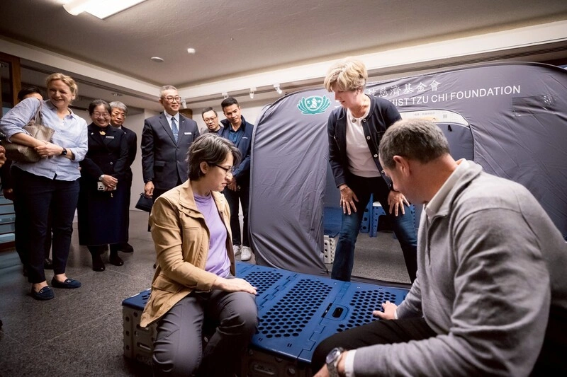 慈濟慈善事業基金會執行長顏博文、慈濟大學校長劉怡均及職工志工團隊熱情接待,並展示可折疊、收納的工具,說明研發理念來自證嚴法師對災民的悲心與尊重。