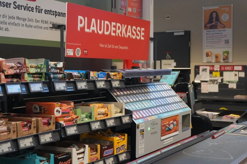 德國連鎖超市Rewe近期在柏林泰戈爾(Tegel)分店設立名為「聊天收銀台」(Plauderkasse)的專用結帳櫃台,消費者可在結帳時與收銀員聊天,不必擔心影響後方排隊顧客。