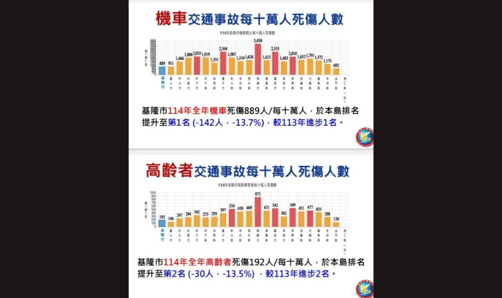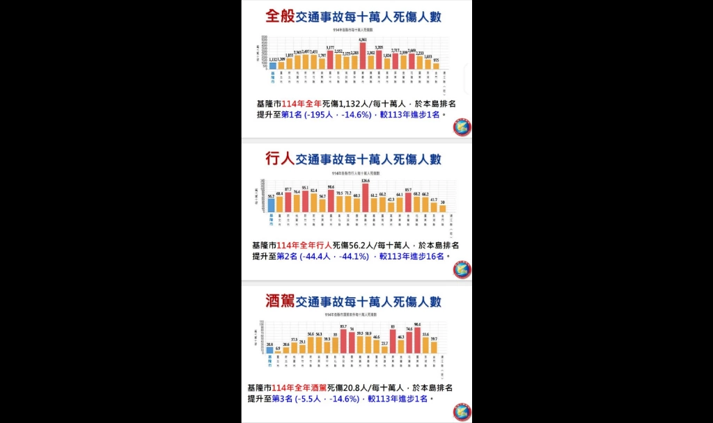 114年基隆市每十萬人行人事故死傷數為56.2人,排名在全國大幅進步16名,位居本島第二低。