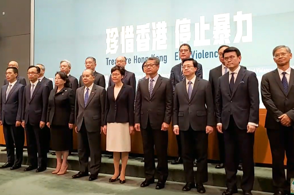林鄭月娥今率同8名政府高層官員召開記者會,宣布確定執行《禁蒙面法》!她指出,這項決定是針對「反送中」示威者在示威衝擊時都戴上面罩,令警方難以辨別身分。一旦違反將處25000港元罰款並處一年監禁,其中蒙面的意思包括使用顏料遮蓋臉部。