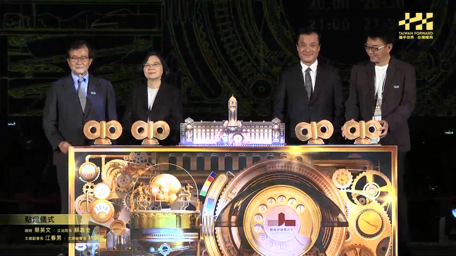 總統府今(4)日開始一連七天舉辦由文化總會策畫的「世界同行·台灣耀飛-2019國慶總統府光雕展演」。本屆主題把「總統府」化為百年時光機,透過光雕回顧過去榮耀並展望台灣未來的想像,蔡英文今晚出席點燈儀式,並誠摯邀請國人一同前來活動現場欣賞百年時光機的運轉。