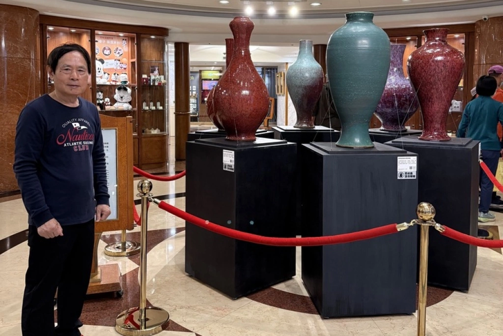施順冰表示,即日起至6月30日,精選王永田的翡翠綠釉春長運榮梅瓶、豇豆紅底紫紅釉流紋蒜頭瓶、霽紅釉長頸天球瓶、寶石紅底翡翠綠釉花直口瓶、豇豆紅底深紫釉流紋高足瓶、寶石紅底花釉紋長頸天球瓶等6件作品,於台中長榮桂冠酒店一樓大廳展出。(編輯:張雅淨)1150328