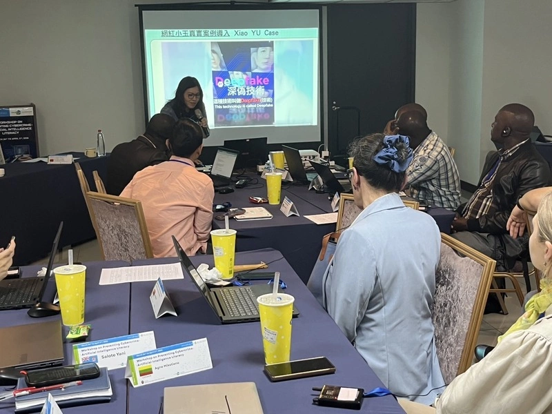 課堂上,陳妤蓁引導各國代表使用「酷AI系統」,向AI詢問問題取得回覆,藉此一步步了解生成式AI的深度偽造(Deepfake)進程、所涉及的法律問題等,同時告知台灣已發生網紅小玉事件。