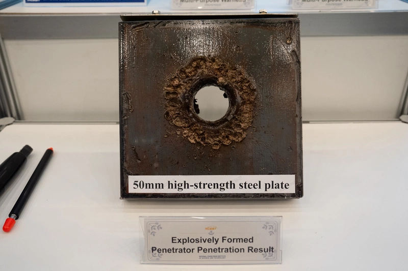 值得注意的是,現場首度展出「多用途無人機彈頭」樣品,其中12公斤版本可掛載於中科院與美國防廠商Kratos Defense & Security Solutions合作生產的「勁蜂4型」無人機,現場還陳展在實彈射擊時,被多用途彈頭貫穿的50公厘高強度鋼板。