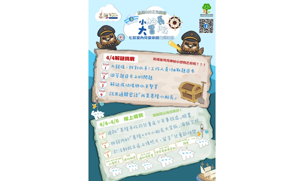 今年兒童節,基隆市政府結合「基隆400」重要里程碑,特別選在4月4日當天,於全市各室內兒童樂園推出「基隆400‧小船長大冒險」活動。