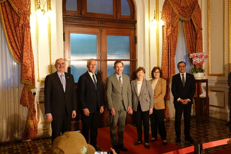 美國聯邦參議員跨黨派訪團下午在台北賓館舉辦記者會,外交部政務次長陳明祺及美國在台協會(AIT)處長谷立言(Raymond Greene)出席與會。