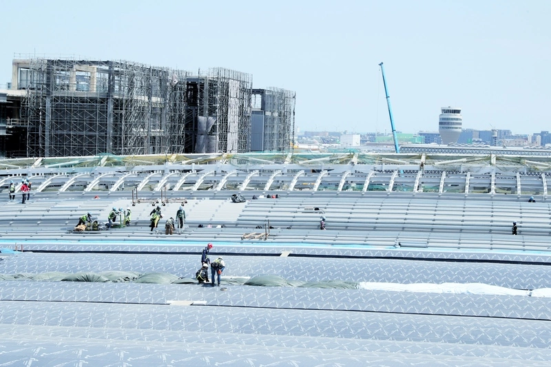 (中央社記者吳睿騏桃園機場2日電)桃園國際機場第3航廈主體屋頂第2階段作業將完成並於4月封頂,屋頂規模相當於16座標準足球場,全台最大,並設總長約10公里天溝導引排水,以因應極端氣候挑戰。