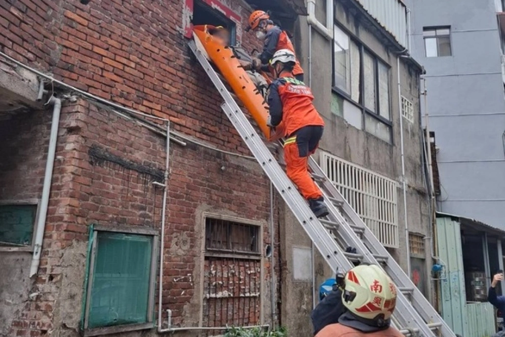 警消指出,屋頂瓦片突然坍塌時,36歲賈姓住戶正在2樓,遭掉落物壓傷且腳部被壓住,由於瓦片仍不斷掉落,消防人員評估後冒險從2樓窗戶進入救援。