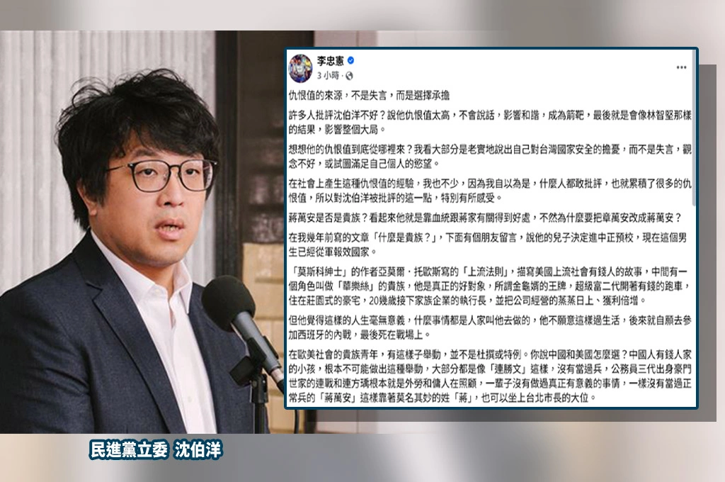 李忠憲表示,當一個人選擇說出讓人不舒服的真話,特別是關於國家安全、價值選擇與風險承擔時,他所承受的「仇恨值」,往往不是來自錯誤,而是來自揭露。沈伯洋被批評、被貼標籤,與其說是因為他「不會說話」,不如說是因為他拒絕讓話變得好聽;而這種不討喜,恰恰正是前面所談「貴族精神」的現代表現形式,願意承擔後果,而不是迎合期待。