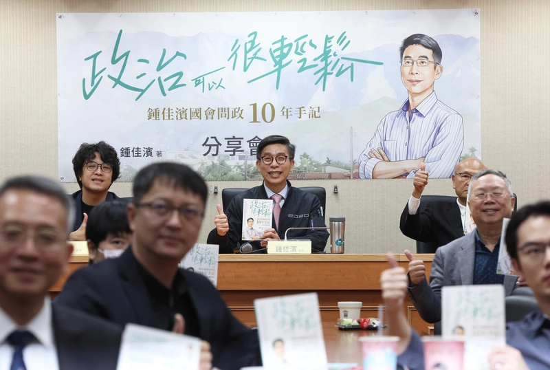 鍾佳濱今天在立法院舉辦「政治可以很輕鬆:鍾佳濱國會問政10年手記」新書發表會,記錄他在立法院推動法案的歷程、為地方需求發聲的心境及政策發想的擘畫,民進黨立委陳培瑜、沈伯洋等人到場祝福。