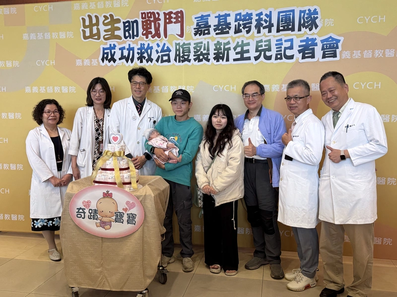 嘉義基督教醫院今天開記者會,醫療團隊說明腹裂是一種先天性腹壁缺損疾病,發生率約為每2000至4000名新生兒中出現1例。腸道未被腹膜包覆,直接暴露於羊水中,出生時常呈現水腫、增厚甚至發炎沾黏。對父母而言,「腸子露在外面」的畫面令人震撼;對醫療團隊而言,這是一場需提前規劃、精密接力的生命守護戰。