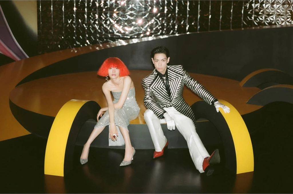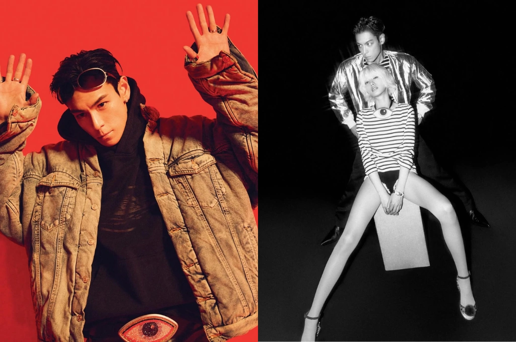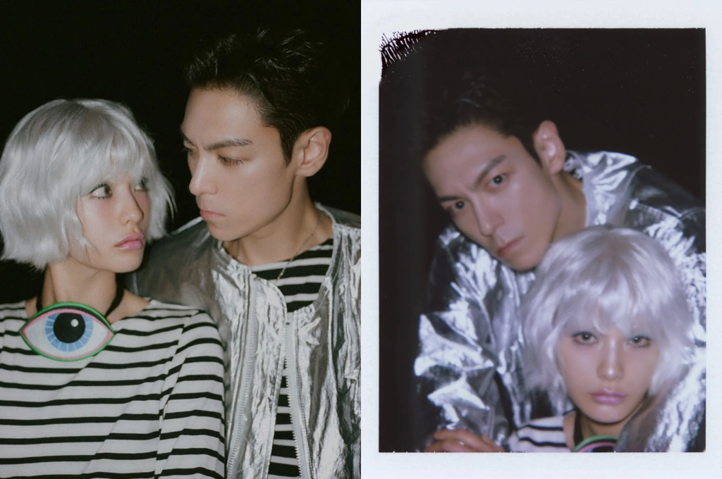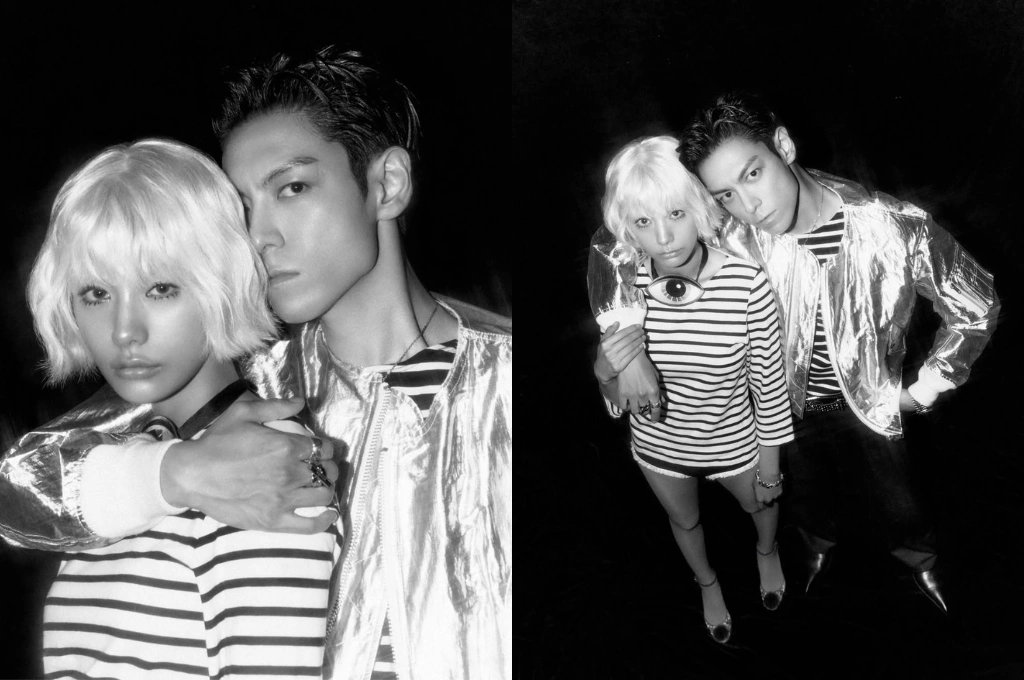 與181公分的T.O.P一前一後同框,畫面張力瞬間拉滿。T.O.P身穿金屬質感飛行夾克,搭配銳利眼神與深刻五官,整體散發出成熟又帶點危險氣息的氛圍。兩人冷調氣場相互呼應,高挑身形與站位配置讓畫面幾乎像時尚大片,視覺存在感非常強烈。