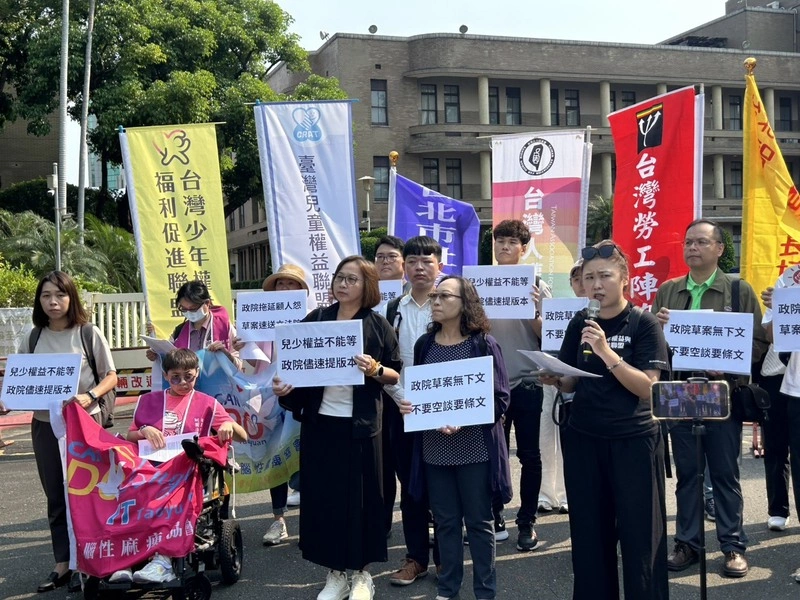 數個兒少社福團體上午至行政院大門前舉行記者會指出,兒少法已15年未修正,現行有許多兒少問題待解決,包含兒少身心健康、兒少受虐、交通安全、身心障礙孩童被安置在老人安養機構、第一線實務人才流失,以及0歲到6歲的死因回溯調查應擴大至18歲等,呼籲行政院與衛福部儘速提出修正草案。